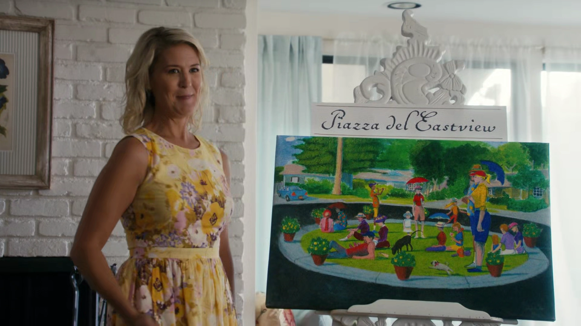 Carol-Joan then oversees the construction of the median and dives into the Italian theme, serving gelato from a cart while toga parties, Italian coffees and bocce games are introduced and welcomed. During the afternoon of their bocce finals, Carol-Joan joins the rest of the neighborhood in heading to the piazza, only to find Jessica sitting there unwilling to move. Marvin then announces to Carol-Joan and the other neighbors that the finals have been postponed and that they should refer to Jamie for a refund on any bets they placed.