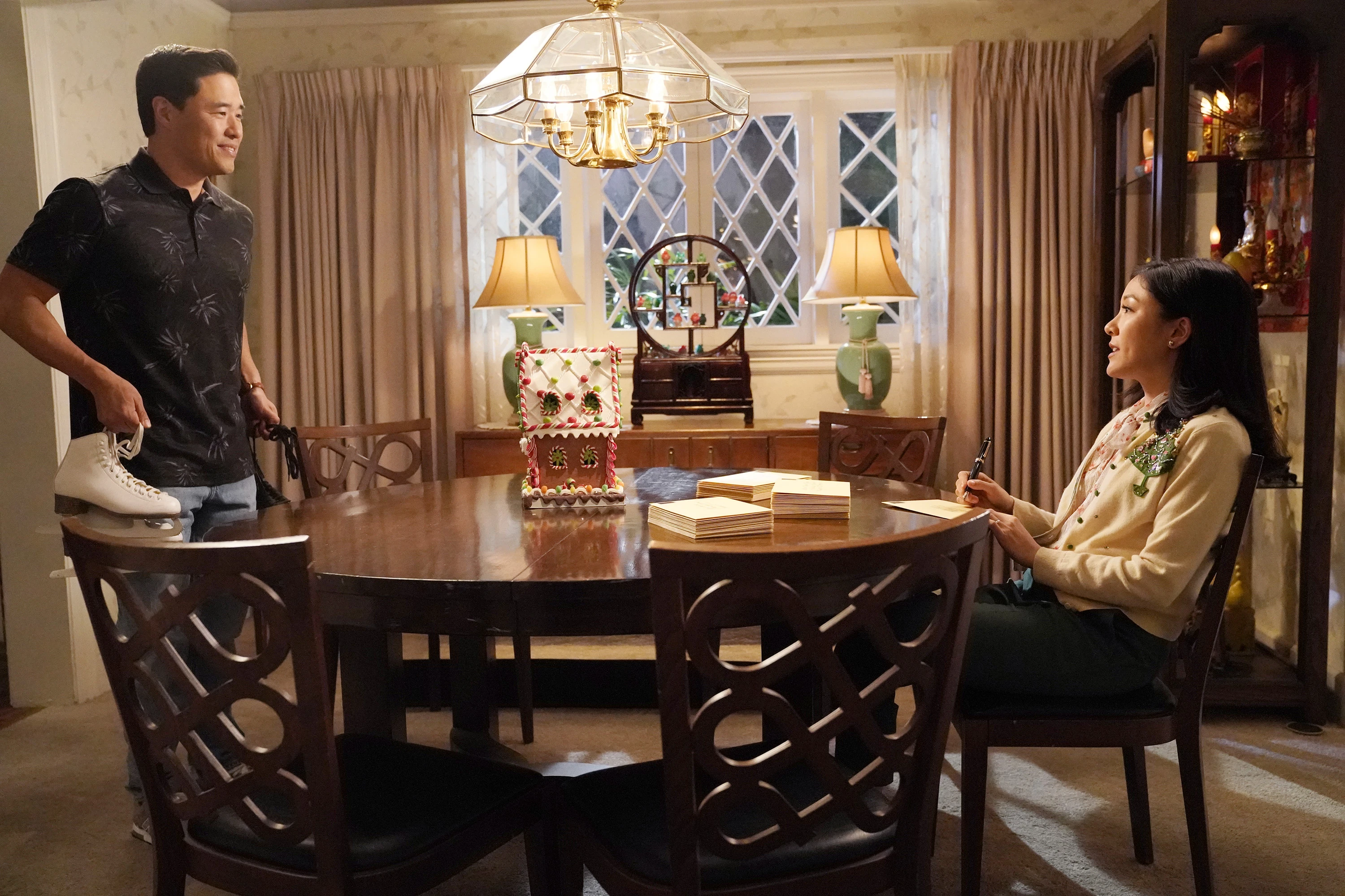 Jessica is busy rewriting the Christmas cards at the table when Louis enters with a pair of skates, asking her if she'd noticed that he'd completed the cards and if she'd like to lace up and join him on the skating rink. Jessica tells them that she cannot go as she must stay and fix "everything [he] did wrong." Louis tells her that she is going overboard and that he does not know what the big deal is. Jessica replies that her Christmas cards kick off the holiday season and that everyone expects perfection from her. Louis offers to help out so that they could go skating, asking how hard it could really be, prompting Jessica to assign him the task of building the life-sized gingerbread house, giving him until the end of the week to complete it.