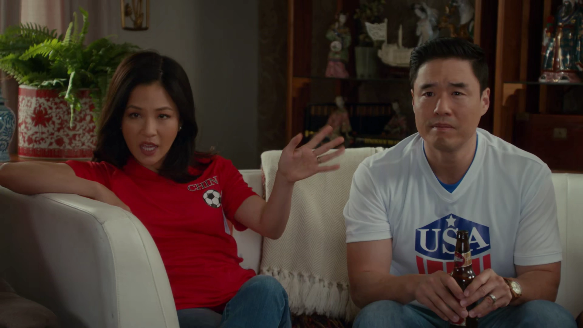 The Huangs, along with Marvin and Honey, have gathered around the television to watch the 1999 FIFA Women's World Cup. Honey is feeding Maria while Marvin groans about the game. Honey has also given birth to her second child, a daughter named Liza, who sleeps. Louis announces that while he would forget about the game in 24 hours, this is his current focus, with him, Eddie, and Evan wearing USA jerseys to support their country while Jessica wears a jersey representing China. Emery, unable to choose whether to represent his native ancestral home or his country, wears half of both jerseys. The game concludes 45 minutes after going into overtime when Brandi Chastain successfully shoots a penalty goal against China, granting the United States team the victory. However, when Chastain gets on his knees and rips off her jersey in victory, the sight of her in her sports bra causes Evan to gain an erection, forcing him to flee from the room immediately.