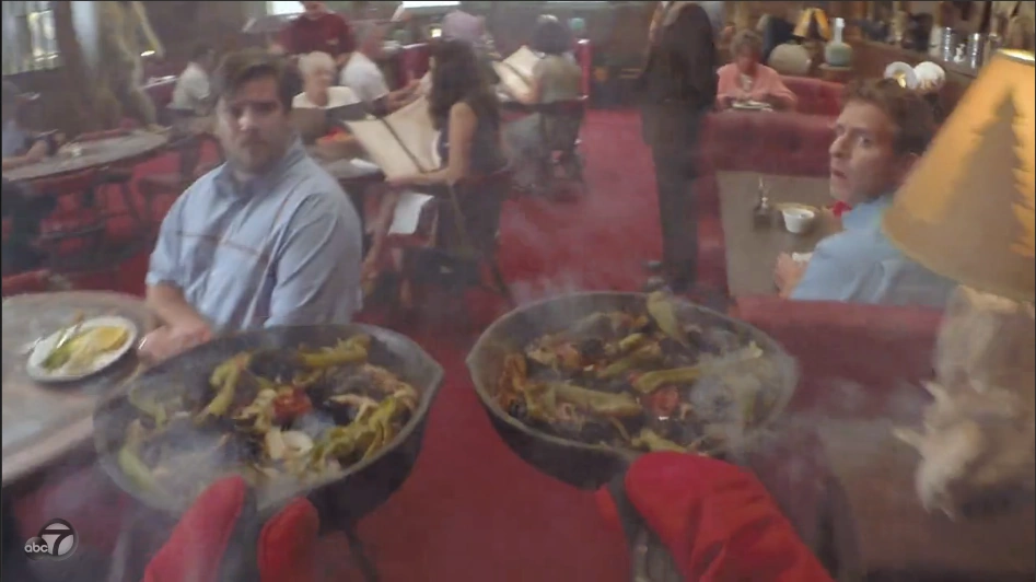The restaurant, as indicated in its name, serves steaks as well as a salad bar, soups, barbeque or pan-grilled meats such as ribs, and fajitas as shown in "Fajita Man". Birthday cake, bread baskets and red wine were seen in "Home Sweet Home-School". Onion blossoms were mentioned in "Pilot".